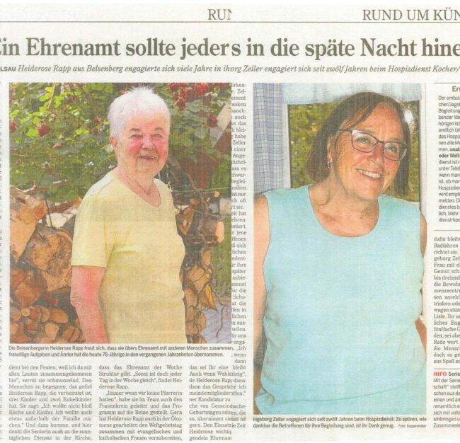 Jeder Mensch hat ein Recht auf ein Sterben unter würdigen Bedingungen -Aktionen des ambulanten Hospizdienste Kocher/Jagst zu den Hospiztagen- Der ambulante Hospizdienst Kocher/Jagst nimmt den deutschen Hospiztag (14 Oktober) und den Welthospiztag (09 Oktober) zum Anlass die Aufmerksamkeit für hospizliche und palliative Belange auch im Hohenlohekreis mit zwei Aktionen zu erhöhen. Die Vorstände des Hospizdienstes…