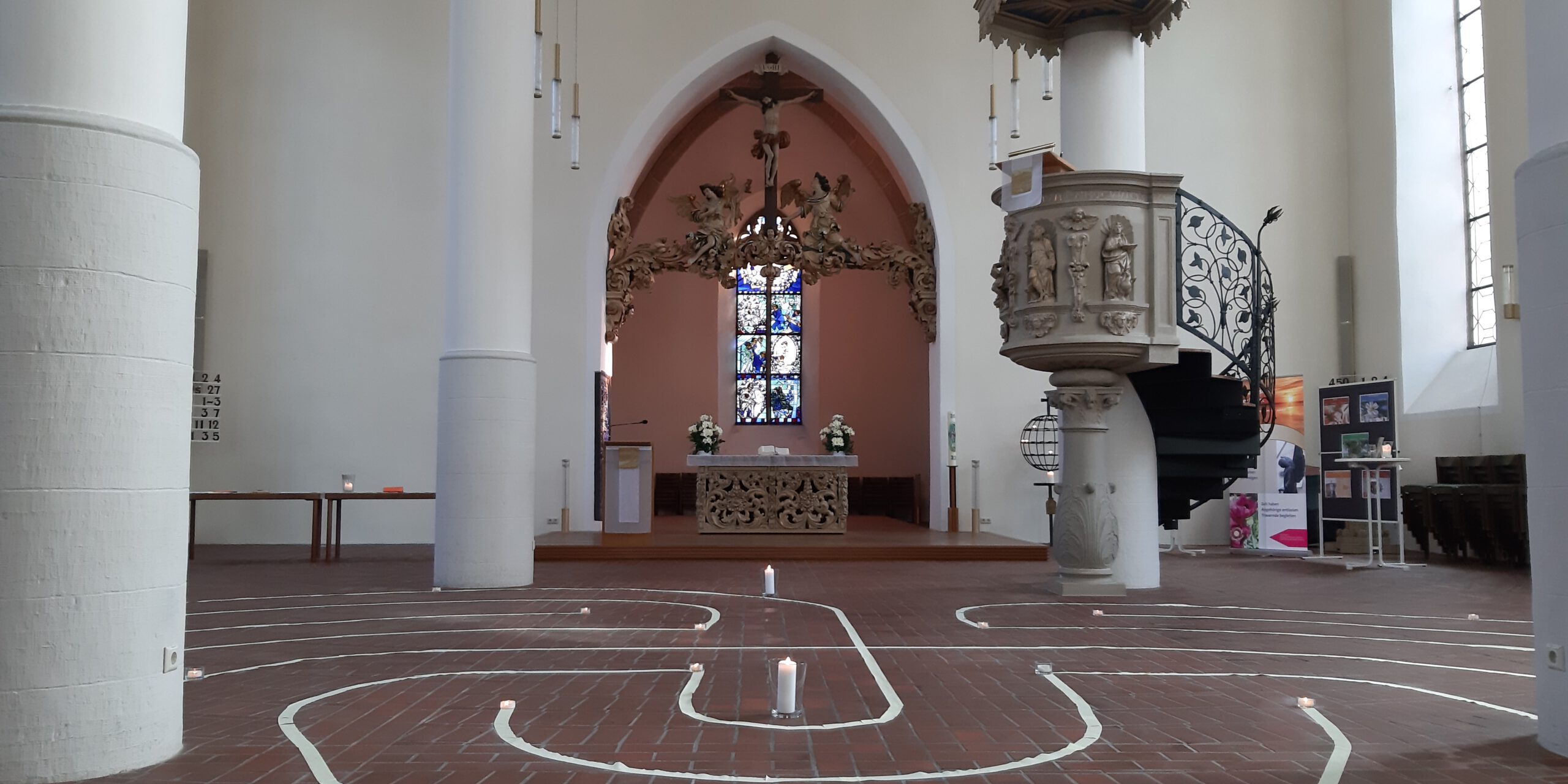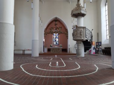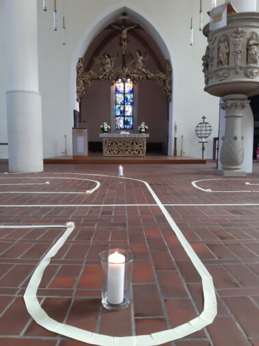 Im christlichen Kontext lässt sich das Symbol des Labyrinths als Weg zur Einkehr deuten, auf dem der Mensch sein Leben bedenken kann. Wer sich selbst, den Sinn des Lebens und Gott erfahren will, der muss auch bereit sein, diesen Weg mit all seinen Kehren und seiner ihm nicht bekannten Länge zu beschreiten. Die vielen Bögen und Wendungen lassen sich als Spiegel der eigenen Lebenswendungen verstehen.Auch in diesem Jahr gab es wieder die Möglichkeit das Labyrinth in der St. Johanneskirche in Künzelsau zu begehen. Das Labyrinth wird jedes Jahr von Ehrenamtlichen der evangelischen Kirche Künzelsau und dem Hospizdienst Kocher/Jagst aufgebaut.