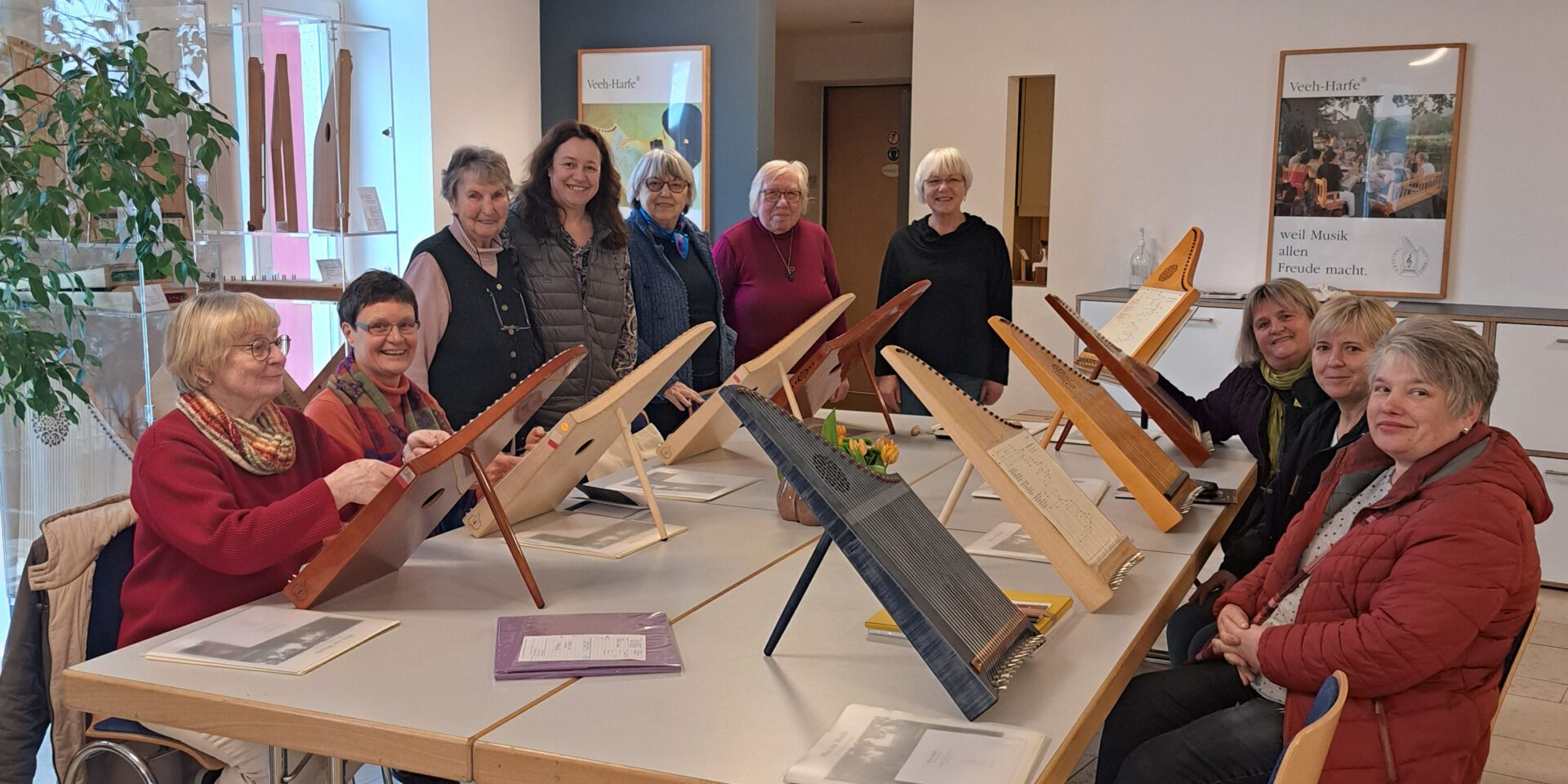 Ehrenamtausflug am 02.02.2024 zur Geburtsstätte der Veehharfe mit Besichtigung der Werkstatt und den Verkaufsräumen in Gülchsheim. Unter der Anleitung von Frau Veeh-Krauß spielten wir zusammen erste Lieder.