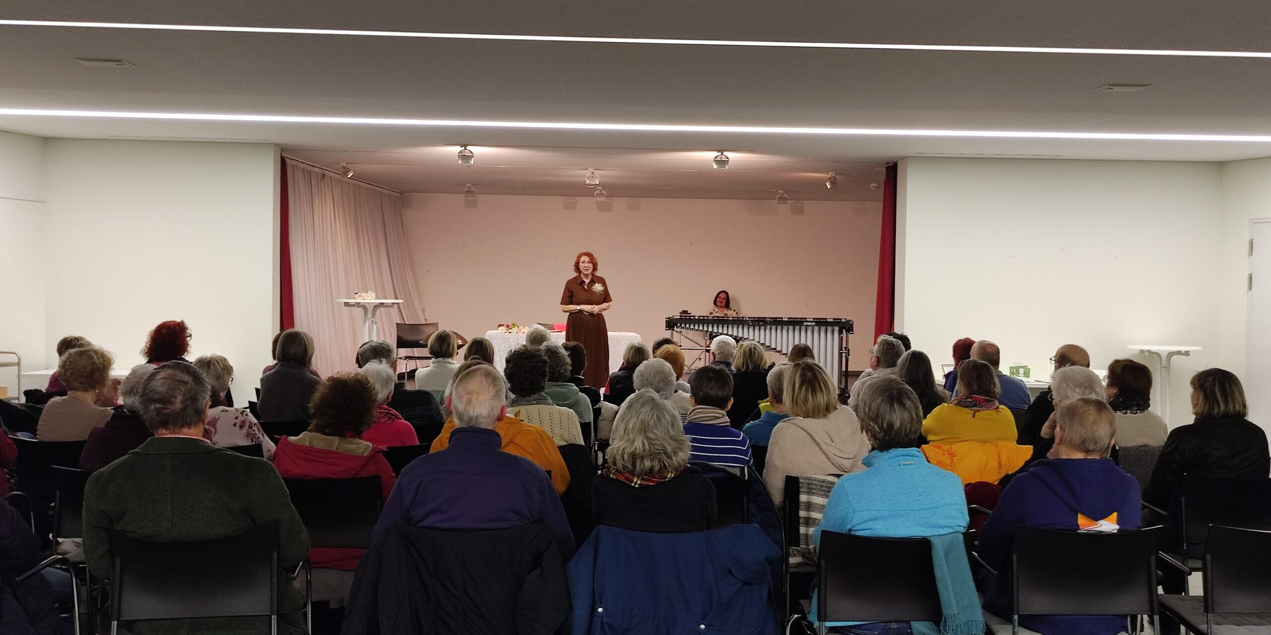 Pünktlich um 18 Uhr betritt Fr. Frey unter der musikalischen Begleitung von Hr. Manuel Ehlich am Marimbafon den großen Saal des Gemeindehaus St. Paulus.