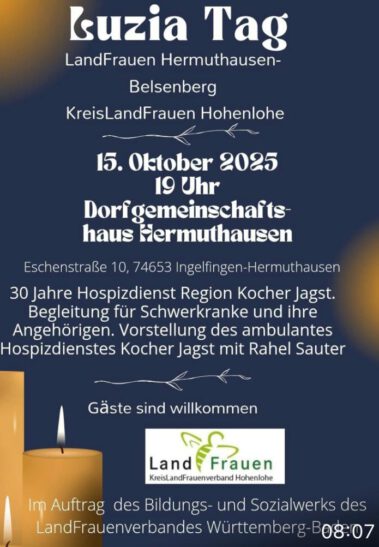 Am 15.10.2025 folgte die stellvertretende Leitung und Koordinatorin des Hospizdienst Kocher/Jagst, Rahel Sauter, der Einladung der Landfrauen Hermuthausen-Belsenberg anlässlich des LUZIA-TAG , in einem Vortrag und anschließendem Austausch den nun schon seit 30 Jahren bestehenden Hospizdienst Kocher/ Jagst vorzustellen.